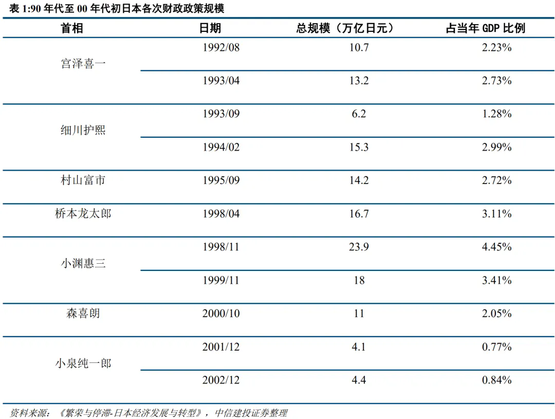 为了进一步刺激不断下滑的经济,日本政府在1992-1994年间实施了4次大规模财政政策,旨在扩大公共投资,帮助中小企业解决面临的问题,促进民间投资。4次财政政策总规模超45万亿日元,基础设施项目占比较高,其中第二次和第四次财政刺激规模先后刷新80年代以来的记录。